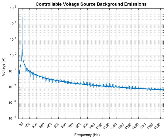 The CVS used was Chroma ATE’s model 61505 [16] configured to output a 50 Hz sinewave at 230 V RMS with a source resistance of 0.4 Ω and a source reactance of 0.8 mH. Measuring the no-load emission produced the background voltage spectrum shown in Figure 4. The total harmonic distortion (THDV), computed according to [8], was 0.31%.