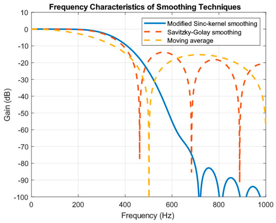 When viewed as a low-pass filter, a well-known drawback of SG smoothing is the low stop-band attenuation and high stop-band ripple. Ref. [19] showed that this can be alleviated by using a Modified Sinc (MS) instead of the usual polynomials, where the modification is the tapering of the Sinc at the beginning and the end to compensate for the ringing that is otherwise typical of SG when the signal changes abruptly. The frequency characteristics of SG and MS are not an explicit property but rather an emergent feature of the smoothing algorithm. We used a frequency sweep to verify their frequency domain characteristics to ensure that the degree and kernel length chosen would not eliminate the frequency under study. Using Equation (2), a filter length of 2651 and a degree of 4 was determined to have a cut-off frequency of 318 Hz. Figure 6 shows the result of a frequency sweep from 0 to 1 kHz for both the standard SG smoother and the MS smoother proposed by [19]. Due to its superior stop-band performance and equivalent pass-band behaviour, the MS smoother was used throughout this work. For comparison, the frequency response of moving average smoothing with a length of 1000 samples was also included.