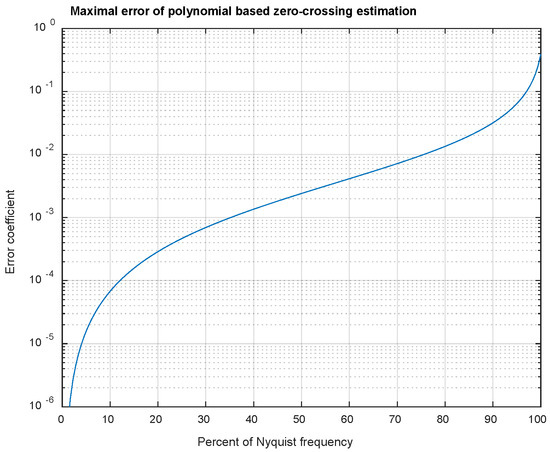 where is the cycle time, is the sample time and is the error coefficient. With polynomial fitting, the accuracy is not limited by the width of the timestep except in the sense that the machine precision could be interpreted as a timestep. While we do not have an analytic expression for the bounds of the error, a sweep through all possible angles for the points closest to the zero crossing with a resolution of 1 degree for each frequency up to the Nyquist frequency yields a maximum error coefficient, as shown in Figure 8. A closer look reveals that the error coefficient at 33% of the Nyquist frequency is less than 1‰, demonstrating that with this method, a sampling frequency of 450 kHz would be sufficient to estimate the cycle length up to 150 kHz with an error that is well below the measurement noise floor.