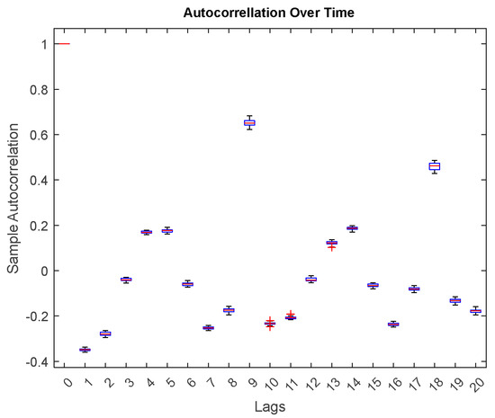 Boxplot of autocorrelation functions for discrete cycle time variations in the ninth harmonic of an LED array. The boxes represent 30 measurements, showing that the autocorrelation functions are stable over time.