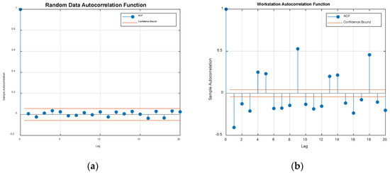 where is the number of samples and is the autocorrelation function at sample [24]. This standard error implies that if the data are Gaussian random, 95.4% of the ACFs will have a lower magnitude than this. The ACFs of random data can be seen in Figure 10a, and the ACFs of discrete cycle times for a computer workstation can be seen in Figure 10b. While random data will, statistically in 4.6% of the cases, create ACFs with a higher autocorrelation than the confidence bound, an autocorrelation as strong as the one shown in Figure 10b would be exceedingly unlikely to be produced by random data.