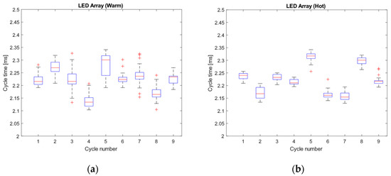 Representative epochs of the discrete cycle time from 30 samples of the ninth harmonic of the LED array. Subfigure (a) shows the behaviour of the LED array after it has been turned on for just over 30 min and (b) shows how the LED array behaves after it has been turned on for more than 1 h.