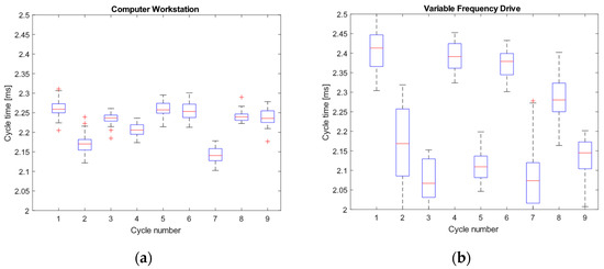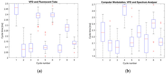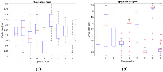 Discrete cycle time of the representative epochs from 30 samples of the ninth harmonic of (a) a fluorescent tube and (b) a spectrum analyser. Note that the vertical axis of the spectrum analyser boxplot is different from that of the other devices.