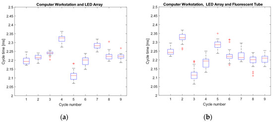 Discrete cycle time of the representative epochs from 30 samples of the ninth harmonic of (a) a combination of a computer workstation and an LED array and (b) the same combination but with an added fluorescent tube. In both of these cases, the LED array was warm, and the computer had completed its booting process.