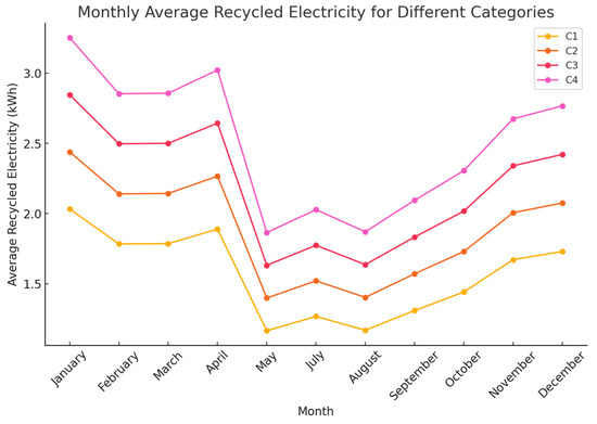 In addition to the factors described in the table, we observe that the amount of energy that can be recycled increases. Table 5 illustrates the basic data on a monthly basis. It is important to note that in very few cases the vehicle battery was almost fully discharged, so that the battery had some amount of current almost constantly, as illustrated in the first column of the table for monthly aggregation. In the second column of the table, the amount of current drawn during the charging process in a given month is shown, and in the last column, the amount of current stored for the whole month is shown. The last row of the table shows the total annual electricity stored depending on the user’s habits.