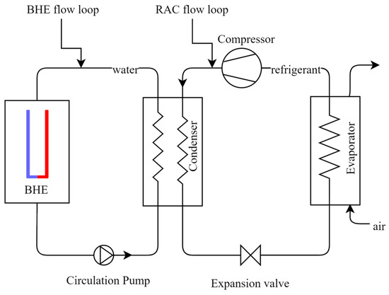A conventional GSRAC incorporates a refrigeration and air conditioning (RAC) system with a single BHE. The BHE harvests the (cold) energy from the relatively low subsurface ground temperature in summer to enhance system performance. A conventional GSRAC system typically includes a BHE that is connected to the RAC unit. This system consists of two flow loops, namely the RAC and BHE loops, which are dedicated to the space cooling system during warm seasons, as shown in Figure 1.