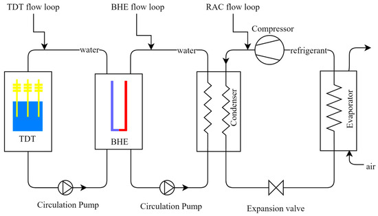 To reduce the thermal imbalance of conventional GSRAC systems used in warm regions, a cold energy storage (CS) unit based on heat pipes is proposed. The GSRAC + CS technology is a hybrid of the TDT and GSRAC, as illustrated in Figure 3. The proposed system consists of three flow loops, namely the RAC, BHE, and TDT flow loops. The RAC-BHE flow loops are dedicated to the space cooling system during warm seasons, while the BHE-TDT flow loop is used for “cold” energy charging during cold seasons.