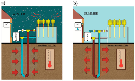 In winter, water circulates between the TDT and BHE, while the RAC system is not functioning (refer to Figure 4a). The TDT passively reduces the water temperature inside the tank to the same level as the minimum ambient temperature. This process, as mentioned above, does not need any additional energy supply. The low-temperature water is then injected into the soil through the existing BHE of the GSRAC system, thereby storing chilled energy in the soil. The stored energy then can be recovered and used in warm seasons by circulating water between the BHE and the RAC system (refer to Figure 4b). The GSRAC + CS system, therefore, has a cross-seasonal “cold” energy storage (CS) capability. The TDT can also harvest day/night ambient temperature fluctuations during summer to enhance the performance of the RAC system; however, the diurnal energy storage of TDT is beyond the scope of this paper.