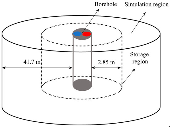 where is the maximum distance to which the heat released by a line source (m) can be transmitted, is the thermal diffusivity of the soil (m2/s), and is the simulation time (s). For the reference case, the radius of the simulation domain is calculated based on 10 years of simulation time to eliminate the boundary effect after 10 years, i.e., substituting = 315,360,000 (s) in Equation (3). However, the radius of the storage region is taken as half of the maximum radius () for 3 months of simulation time, which is equal to the duration of the heat injection period at each year cycle. The reason is that the maximum temperature gradient occurs within the inner half of . The thermal diffusivity of soil is taken as 4.6 × 10−7 m2/s in this study. As a result, the radius of the simulation domain and storage region are 41.70 m and 2.85 m from the surface of the BHE, respectively, as shown in Figure 6.