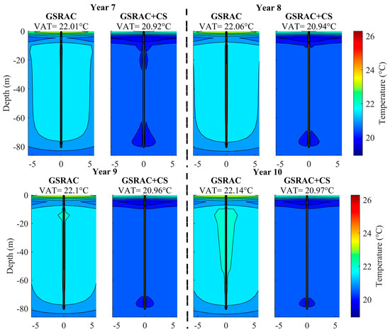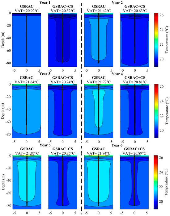To understand the natural and forced recovery of the storage region, the soil temperature profiles of the baseline scenario without and with heat rejection (the GSRAC and GSRAC + S systems) at the beginning of the discharging phase (day 184) are simulated. The outcomes are illustrated in Figure 7. In the cold storage field, the VAT of the GSRAC system continuously increased from 20.92 °C to 22.14 °C over ten years, while for the GSRAC + CS system, the increase in VAT was much less (20.97 °C) after ten years, indicating that there would be a less severe thermal imbalance issue with GSRAC + CS system. In particular, the lower VAT would be better for the RAC system, since the rate of heat transfer between the soil and the BHE increases; therefore, a higher amount of heat can be injected into the ground. Therefore, in the GSRAC + CS system, the BHE can be operated sustainably for extended periods, while, for the GSRAC system, the performance of the BHE and RAC unit deteriorated over time.