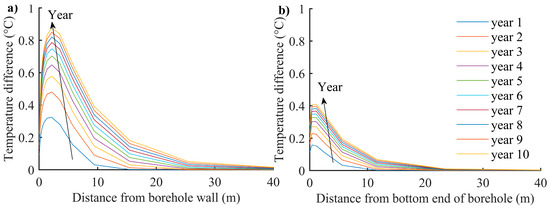The soil temperature difference between GSRAC and GSRAC + CS system at the end of summer over a simulation time, (a) at different distances from the BHE wall in the transverse direction, and (b) at different distances from the bottom end of the BHE in the vertical direction. The arrows indicate the ascending order of the year.
