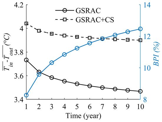 Figure 10 presents the fluid temperature difference between the BHE inlet and outlet for the GSRAC and GSRAC + CS systems in black (left axis) and BPI in blue (right axis) during each year of a simulation. What can be clearly seen in this figure is the rapid decrease in the fluid temperature difference between the BHE inlet and outlet of the GSRAC system from approximately 3.70 °C to 3.46 °C during the system operation. By contrast, in the GSRAC + CS system, the fluid temperature difference between the BHE inlet and outlet, decreased from 4.00 °C to only 3.90 °C. The effects of cold energy charging on the overall performance of BHE can also be revealed in Figure 11. Compared with the conventional GSRAC system, the performance of the BHE is enhanced, on average, by 11% over the system operation. Due to this performance enhancement, the required depth of BHE can be reduced. Thus, the simulation results imply that the overall performance of the BHE is relatively improved by integrating TDT into the GSRAC system.