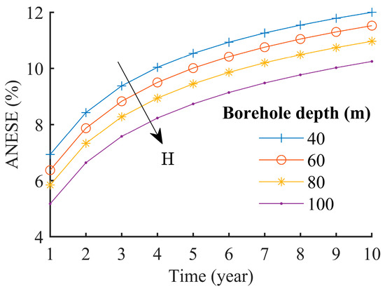 Variations in annual net energy storage efficiency (ANESE) for different values of BHE depth. The arrow indicates the ascending order of the borehole depth.