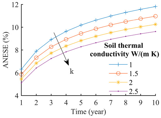 It should be noted that the current definition of the ANESE parameter in this paper is different from the energy storage efficiency used in [32,33]. Here, the ANESE represents the enhancement in the energy storage efficiency due to the hybridisation only, while in the mentioned references, the energy storage efficiency includes the enhancement achieved from both the hybridisation and natural recovery of soil temperature.
