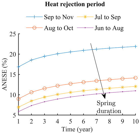Figure 9 shows the ANESE during each year of the ten-year simulation period. The results indicate that the proposed GSRAC + CS system can achieve a performance improvement of about 6% in the first year; moreover, it increases to more than 10% after ten years. This performance improvement is attributed to the difference of 0.07 to 0.92 °C in the outlet fluid temperatures between the GSRAC and GSRAC + CS systems during discharging seasons. Although this performance improvement may not be considered to be very significant, it may indeed be very essential if the rejected heat is achieved from a passive strategy, i.e., using the TDT.
