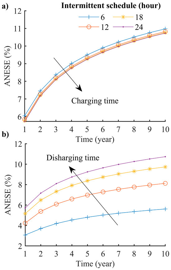 The Annual Net Energy Storage Efficiency (ANESE) is accepted in this work as the basic performance improvement indicator. This parameter is used to estimate the useful stored energy that can be extracted from the system. As given in Equation (4), the ANESE due to the hybrid effect was defined as the ratio of the increase in the injected heat during discharging period to the extracted heat during the charging period. The higher the ANESE is, the more extracted heat can be injected. Namely, the ANESE in year i is the following:
