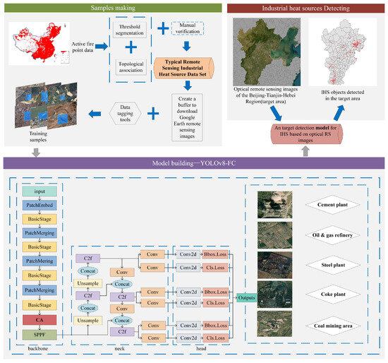 Limited training data and the diverse characteristics of IHS objects under complex backgrounds present significant challenges for accurate detection. To address these issues, an innovative multiclass IHS detection model based on an improved YOLOv8-FC approach, utilizing high-resolution optical remote sensing images from Google Earth, was proposed in this paper. First, new training datasets containing data derived from cement plants, coke plants, coal mining areas, oil and gas refineries, and steel plants were constructed via Google Earth images and point-of-interest (POI) information. Second, the proposed YOLOv8-FC model introduces significant innovations in network design to balance detection accuracy and operational speed. It integrates the FasterNet [49] architecture to enhance computational efficiency while maintaining detection accuracy, and the Coordinate Attention (CA) [50] module, which improves the model’s precision by focusing on spatial information features. To further address class imbalance in training samples, mosaic augmentation techniques were applied, improving the model’s performance across varying IHS categories. Finally, the model was applied to detect and classify multiclass HIS targets in the Beijing–Tianjin–Hebei (BTH) region. The resulting BTH dataset, annotated with category-specific attributes, demonstrated the superiority of the proposed model compared to existing datasets. The findings confirm the effectiveness of this approach in achieving high-precision multiclass IHS detection and classification under complex real-world conditions.