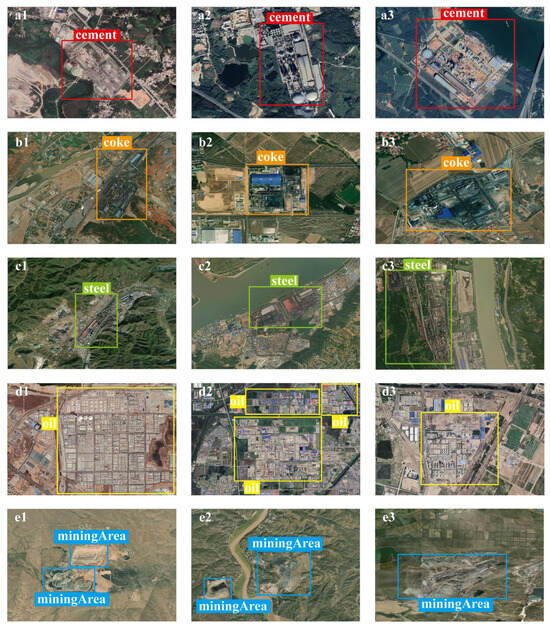 Remote sensing images of different types of IHSs. (a1–a3) represent cement plants, (b1–b3) represent coke plants, (c1–c3) represent steel plants, (d1–d3) represent oil and gas refineries, and (e1–e3) represent coal mining areas.