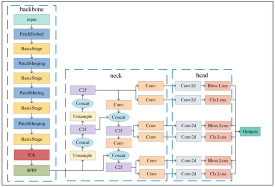 The main structure of the YOLOv8-FC model contains three parts: backbone, neck, and head components. More information is shown in Figure 3. For a clearer representation, Figure 4 provides a simplified architectural diagram that visually depicts the input–output flow of the model.
