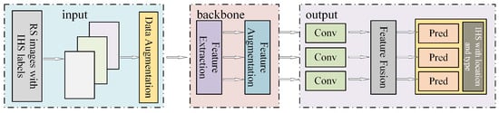 With the rapid advancement of deep learning, neural network models with recognition and characterization capabilities have become crucial methods for detecting targets in high-resolution optical remote sensing imagery [29,30,31,32]. The mainstream target detection algorithms that use neural network models can be categorized into two-stage detection algorithms and one-stage detection algorithms [33]. Two-stage algorithms, such as R-CNN series [34,35,36], TSD [37], and R-FCN [38], divide the detection process into region proposal (RP) and classification stages [39]. In contrast, one-stage algorithms, including YOLO [40], SSD [41], RetinaNet [42], and OverFeat [43], simplify the process by directly generating object category probabilities and coordinates, making them faster and more efficient. Recent advancements have further improved detection accuracy in remote sensing, such as using CenterNet with attention mechanisms to detect small and dense targets [44] or enhancing YOLO-based methods to address challenges like complex backgrounds and small target sizes [45,46,47,48]. However, despite significant progress, these methods are not specifically designed for detecting and classifying HIS objects, which require specialized optimization due to their diverse characteristics and presence in complex environments.