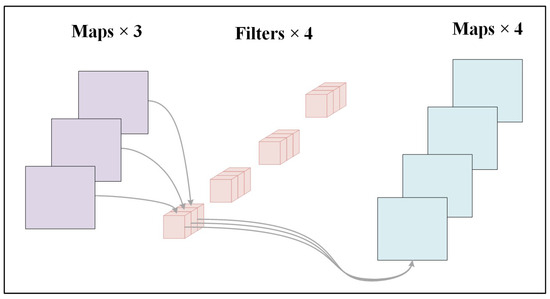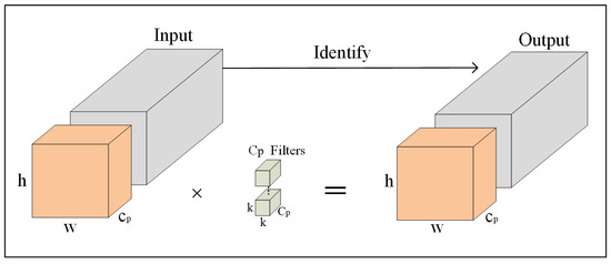 The PWConv operation, while conceptually similar to the standard convolution operation, is distinguished by its use of a kernel size of 1 × 1 × m, where m represents the depth of the previous layer. Unlike traditional convolutions, which process spatial and depth dimensions simultaneously, PWConv exclusively operates along the depth dimension. This enables the aggregation of feature maps from the preceding layer in a weighted manner, effectively synthesizing diverse features into a unified representation. By employing multiple filters, PWConv generates a variety of new feature maps, enhancing the model’s ability to capture intricate patterns across channels. The structural details of PWConv are depicted in Figure 6, illustrating its streamlined yet powerful design.