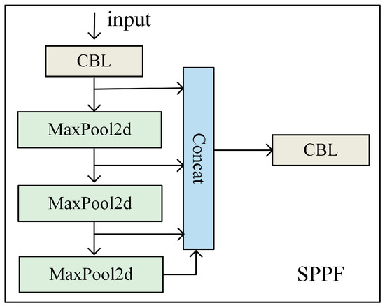 Spatial pyramid pooling (SPP) is a widely adopted technique in image recognition and target detection tasks that facilitates multiscale feature extraction and encoding. It allows arbitrarily sized images to be input and resizes them to a fixed dimension, producing fixed-length feature vectors that are suitable for consistent model processing. SPPF is an optimized version of SPP that was designed to replace the parallel structure of the original SPP module with a more efficient architecture. This innovation reduces the incurred computational complexity while maintaining equivalent functionality. The structure of SPPF is illustrated in Figure 7.