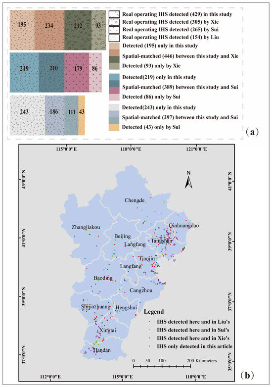 3. A total of 429 IHS objects, including 69 cement plants, 131 coke plants, 19 coal mining areas, 140 oil and gas refineries, 70 steel plants, and 59 inaccurately categorized IHS objects, were successfully detected in the BTH region. The results revealed that the IHS spatial distribution in the BTH region exhibited localized clustering, which was primarily concentrated in the southern and central coastal areas. The number of IHSs and overlap value of the proposed approach were higher than those of the other datasets and remained between 25.81% and 178.57% and between 14.16% and 43.36%, respectively.