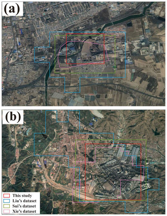 Comparison among the detection boxes of different databases. (a) shows the detection results produced by each dataset for the same coke plant, and (b) shows the detection results produced by each dataset for the same steel plant.
