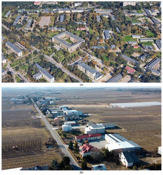 The research focused on two locations: Wodziczna village (Figure 1b) and the campus of the Military University of Technology in Warsaw (MUT) (Figure 1a). For each of these locations, various sources of data were used to assess the solar potential.