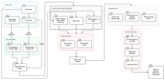 The first step in generating a map of the solar potential of buildings is the preparation of input data. Imagery obtained at low altitudes and LIDAR data obtained from ALS are used. Then, the data are processed to the form of a Digital Surface Model (DSM). Low-altitude imagery data were processed with Pix4Dmapper, where a DSM is generated, and LIDAR (ALS) data were processed in ArcGIS Pro, where a DSM was created. It is worth mentioning that a DSM generated from ALS data is already available in Geoportal, so that it is not necessary to process the ALS data.