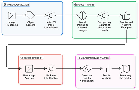 Existing solar panels are detected with the use of satellite imagery [43] and low-altitude images. Deep learning methods are also commonly used [44,45]. The results of the detection of solar panels in satellite imagery are characterized by a low level of detail and are mainly designated for the determination of the possibilities of generating photovoltaic power in the given area, in general terms. Due to its higher resolution, imagery acquired from UAV in the RGB and NIR channels is a more frequently selected source of data for the detection of photovoltaic panels than satellite imagery.