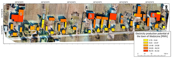 The potential for power generation with the power generation from existing photovoltaic panels in Wodziczna village is presented in Table 7, based on three datasets: low-altitude imagery data from UAV and LIDAR data from ALS, at various mesh sizes. The results demonstrate (Figure 14) that the power generation of existing systems is approximately 30 MWh lower than the data in the maps of solar power generation potential. One may notice that for House 3, the power generation potential in the map is the same as the power generation from the installed photovoltaic system. The data from the maps of power generation potential created based on data from UAV show the greatest potential for power generation.