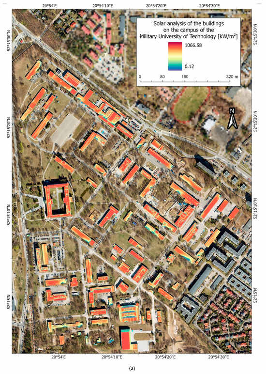 Then, a solar map is generated with the use of the “Raster Solar Radiation” tool in ArcGIS Pro for two areas: the Military University of Technology and Wodziczna village. At this stage, the Input Surface Raster was the DSM, the Start date and Time for our analysis was 1 January 2023, and the End Date and Time was 1 January 2024. The Input Analysis Mask was the footprints of buildings (cells that are located outside the polygons); building footprints were not calculated. They have the value of NoData and are not displayed.
