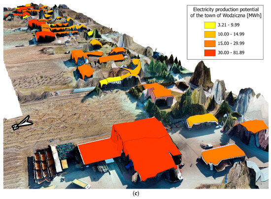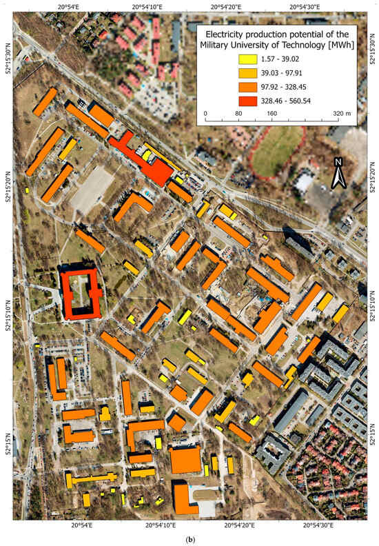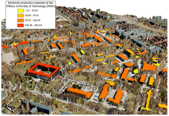 In conclusion, this study demonstrated that photogrammetric and LIDAR data, supported by advanced GIS technologies, are indispensable tools for assessing the solar potential of buildings. These findings can significantly support the development of renewable energy systems. Municipalities could use these results to optimize the placement of solar installations by prioritizing buildings with the highest potential, focusing on public and commercial buildings as initial sites. Additionally, local governments can incorporate the findings into zoning laws and renewable energy strategies, ensuring that new developments take full advantage of solar resources. Such actions would not only contribute to increasing the share of renewable energy but also drive economic growth by attracting investments in the green energy sector.