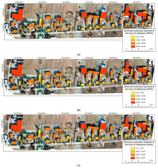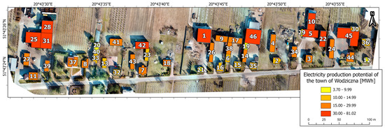 Energy production from existing photovoltaic systems and photovoltaic panels in the village of Wodziczna is presented in Table 8. The analysis is based on three datasets: low-altitude imagery and LIDAR data from ALS, each analyzed at various mesh sizes (1.75 cm for low-altitude imagery, 10 cm and 100 cm for LIDAR data). The table compares actual energy production, sourced from publicly available online platforms provided by PV system owners, with the calculated energy production potential for the vectorized surfaces of the photovoltaic systems.