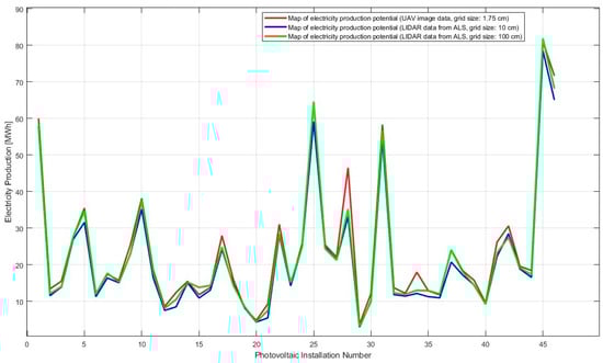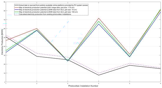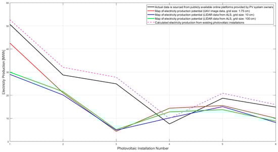 The analysis of Figure 13 demonstrates a comparison of data on actual electricity production from existing photovoltaic systems with data from energy production potential maps and estimated production potential. The graph compares the values of potential electricity production derived from various sources: UAV image data with a 1.75 cm grid (red line), LIDAR ALS data with a 10 cm grid (blue line), and a 100 cm grid (green line), as well as calculated energy production from existing photovoltaic installations (purple dashed line). The black line represents actual energy production data obtained from publicly accessible online platforms shared by PV system owners.