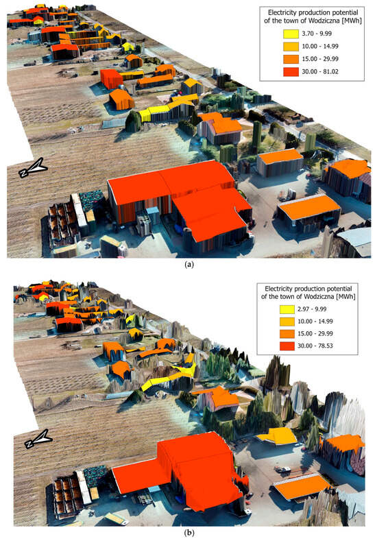 It is worth noting that the values given are approximate and may differ from actual values. Potential maps may also deviate from actual conditions. Figure 12 shows photovoltaic panels partially shaded by others, which reduces their efficiency.