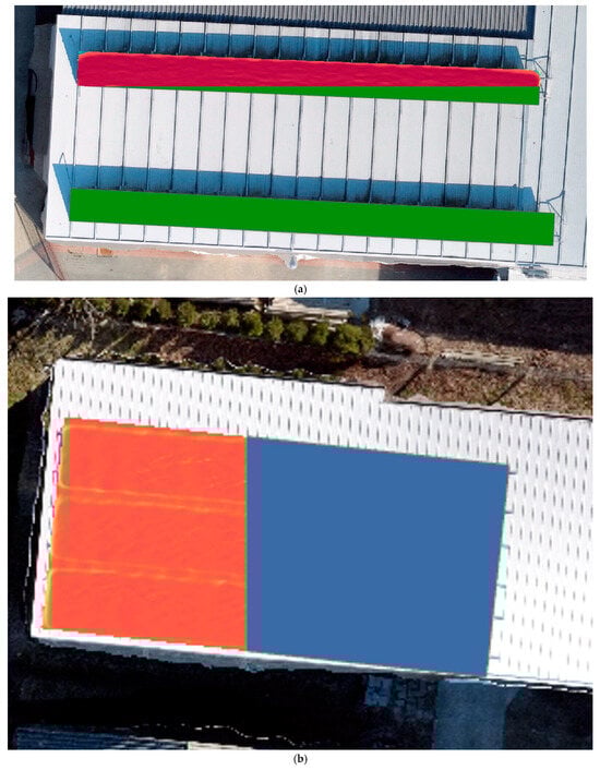 Power generation from photovoltaic systems—vectorized areas of photovoltaic panels. (a) vectorization of a photovoltaic system where the panels are separated; (b) vectorization of a photovoltaic system.