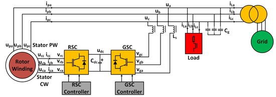 The system model investigated in this work is illustrated in Figure 1. The BDFIG comprises two stator windings: one dedicated to power and the other to control. These windings are connected via the rotor winding of the generator. The stator power winding interfaces with both a three-phase resistive-inductive load and the grid through a transformer. The stator control winding is linked to two voltage source converters arranged in a back-to-back configuration, known as the RSC and GSC. A DC-link bridges the two converters, allowing for independent design of their respective controllers. The GSC is connected to the stator power winding at the point of common coupling (PCC). To minimize voltage ripples in the stator power winding and filter harmonics generated by the GSC, a capacitor bank is employed. The load is modeled using the equivalent resistance and inductance . A summary of the notations utilized in this paper is provided in Abbreviations section.