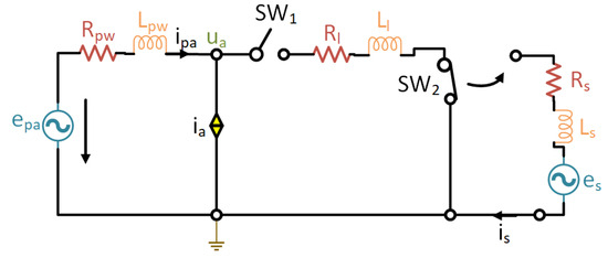 where the voltage amplitude following the short-circuit is represented by . In the event of a short-circuit fault, the switch depicted in Figure 3 will be left closed, leading to stator control winding current: