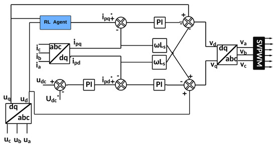 Figure 6 illustrates the architecture of the proposed GSC controller, which integrates an RL-agent to enhance its adaptability and performance. The PCC voltage is provided as an input to the RL agent. Based on this input, the RL agent calculates and outputs the reference current , which serves as the setpoint for the control loops.