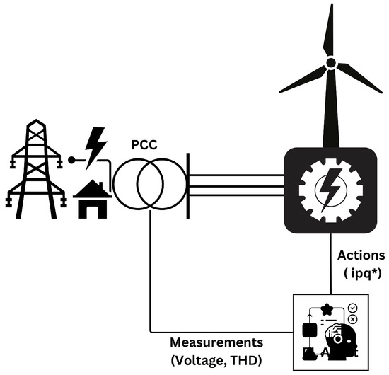 - receives the environment’s state, , i.e., the measured voltage drop and the total harmonic distortion (THD) of voltage at the PCC. Accordingly, the agent takes an action, , i.e., compute the optimal reference value for the PW reactive current using one of the available optimization methods/algorithms.