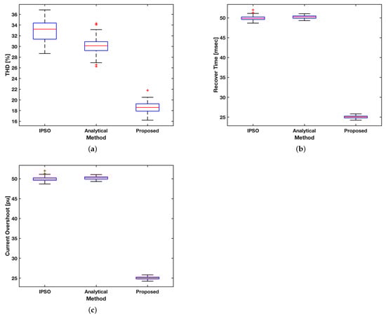 Variability in performance metrics. (a) THD. (b) Recovery time. (c) Current overshoot.