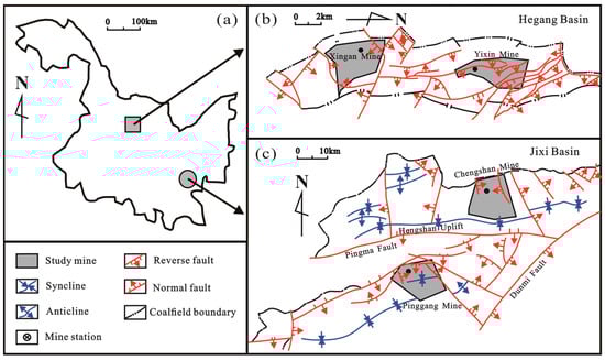 Location map of the study area: (a) outline map of Heilongjiang Province; (b) regional geological structure map of the Hegang Basin; (c) regional geological structure map of the Jixi Basin.