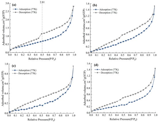 Different types of materials yield distinct adsorption isotherm patterns when analyzed using gas adsorption methods. In 2015, the International Union of Pure and Applied Chemistry (IUPAC) updated the classification of adsorption hysteresis loops originally defined in 1985, expanding from four types (H1, H2(a), H3, and H4) to six types: H1, H2(a), H2(b), H3, H4, and H5 [31]. As shown in Figure 2a–d, the adsorption–desorption curves of the four tectonic coal samples exhibit similar adsorption hysteresis loop types. They all diverge at a relative pressure of (P/P0 = 1.0) and reconverge at approximately (P/P0 = 0.1). Therefore, they are all classified as H3-type adsorption hysteresis loops.