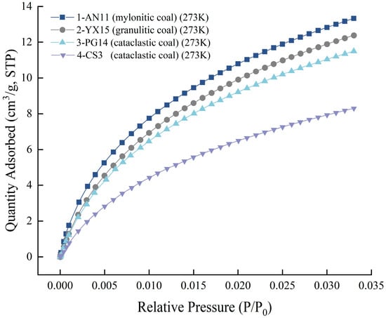 Unlike the low-temperature N2 adsorption experiment, the CO2 adsorption isotherms of all four samples exhibit an upward convex shape (Figure 3). The CO2 adsorption capacity increases steadily with rising relative pressure, while the rate of increase gradually decreases. Notably, the maximum CO2 adsorption capacity was not reached by the end of the experiment. Among them, the 1-AN11 sample (mylonitic coal), which exhibits the highest degree of tectonic deformation, shows the greatest CO2 adsorption capacity, while the 4-CS3 sample (cataclastic coal), with the lowest degree of tectonic deformation, shows the smallest CO2 adsorption capacity. Figure 2 and Figure 3 clearly illustrate that the CO2 adsorption capacities of the four samples are significantly higher than their N2 adsorption capacities.