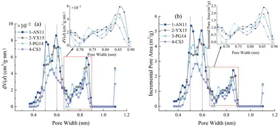 Figure 4a,b show the distribution of micropore volume and pore-specific surface area across different pore sizes. As the pore diameter increases, the pore volume and pore-specific surface area of all samples exhibit an “increase–decrease–increase–decrease” M-shaped bimodal distribution. The two peaks of the M-shaped curve indicate that within these pore diameter ranges, both the micropore volume and pore-specific surface area are relatively high, meaning the micropores are primarily concentrated within these two ranges: 0.5–0.7 nm and 0.8–0.9 nm. Among them, the pore diameter range of 0.5–0.7 nm has the largest proportion of pores. Based on the height of the curves for each sample, the 1-AN11 sample (mylonitic coal), which has the highest degree of tectonic deformation, shows the largest pore volume and pore-specific surface area, while the 4-CS3 sample (cataclastic coal), with the least tectonic deformation, exhibits the smallest pore volume and pore-specific surface area.