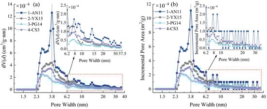 As shown in Figure 5a,b, the distribution of mesopore volume and pore-specific surface area across different pore sizes in the four experimental samples is presented. As the pore diameter increases, the mesopore volume and pore-specific surface area of all samples exhibit the same trend, showing a unimodal distribution with an “increase–decrease” pattern. The mesopores are primarily distributed between 2.3 nm and 6.2 nm. Based on the order of the curve heights in the figure, it is evident that the mesopore volume and pore-specific surface area of the 1-AN11 (mylonitic coal) sample, which exhibits the highest degree of tectonic metamorphism, remain the largest among the four samples, while the 3-PG14 (cataclastic coal) sample, with a relatively lower degree of tectonic deformation, shows the smallest values.