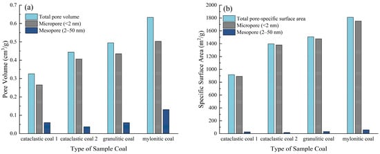 According to Table 2 and Figure 6a, the total pore volume of the coal samples, from largest to smallest, has the following order: mylonitic coal (1-AN11), granulitic coal (2-YX15), cataclastic coal 2 (3-PG14), and cataclastic coal 1 (4-CS3). Similarly, the pore volumes of micropores and mesopores also generally follow this order: mylonitic coal > granulitic coal > cataclastic coal. In other words, as the coal structure undergoes deformation and damage under tectonic stress, the internal pore volume of the coal correspondingly increases [36].