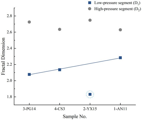The calculation results are shown in Table 2, the determination coefficient R2 of the data fitting for the four samples is greater than 0.85, indicating a high degree of goodness of fit and reliable fitting results. Moreover, except for the fractal dimension D1 of the 2-YX15 sample in the low-pressure segment, which falls outside the valid range of 2–3, the fractal dimensions of all other samples are within the valid range, indicating that the pores in all four tectonically deformed coal samples exhibit clear fractal characteristics. As shown in Figure 7, the fractal dimension D1 in the low-pressure segment is consistently lower than the fractal dimension D2 in the high-pressure segment. After removing outliers, D1 in the low-pressure segment gradually increases with the degree of structural deformation in the coal samples, while D2 in the high-pressure segment exhibits no clear pattern. Therefore, the fractal dimension (D1) in the low relative pressure range (P/P0 < 0.5) is selected for further discussion (Table 3).